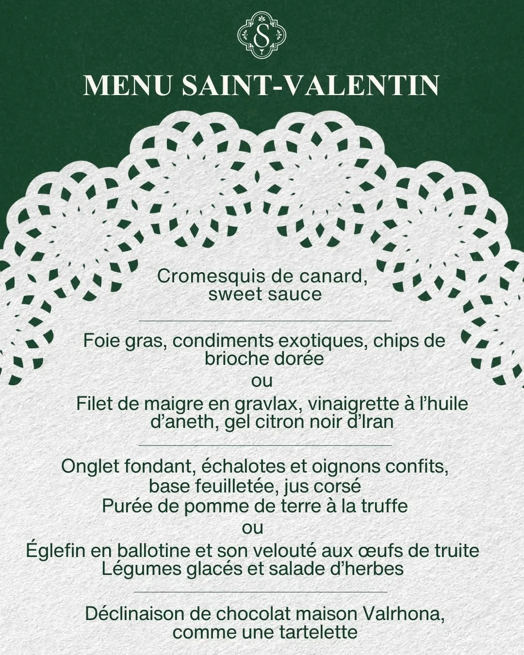 À l’occasion de la Saint-Valentin, notre chef vous propose de dîner à la carte ou de découvrir son menu suggestion à 55 €, sur réservation